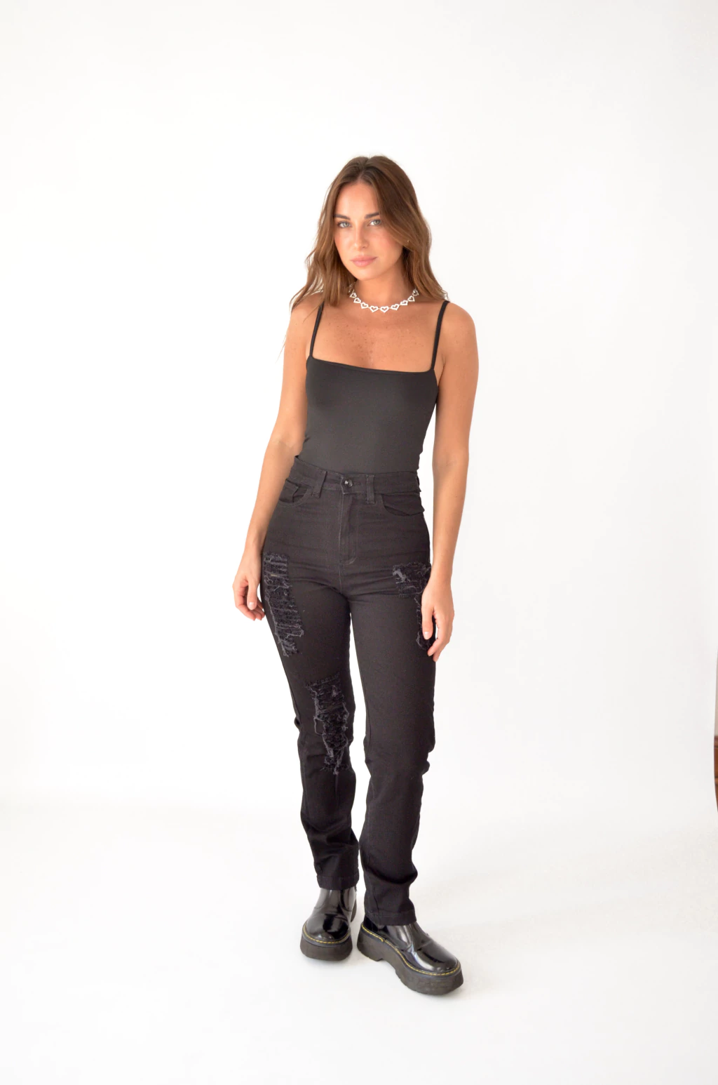 Jean mom tiro SUPER alto elastizado, con roturas y recto.